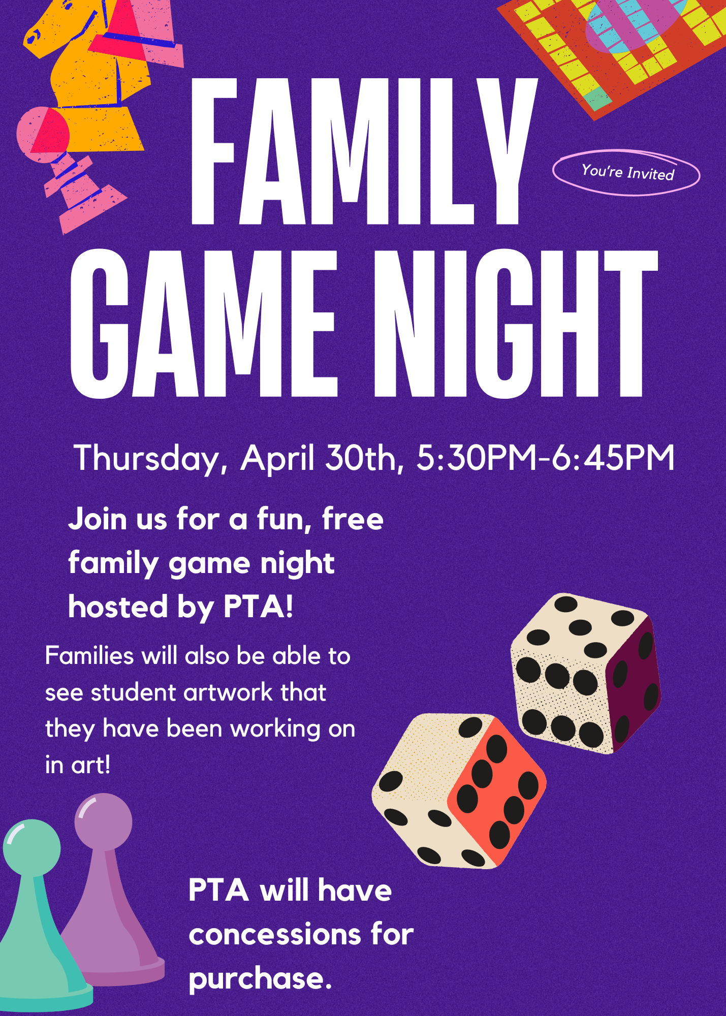 PTA Family Game Night: Thursday, April 30th, 5:30pm-6:45pm, in the cafe. Please join us in the cafe for a night of free, family fun! PTA will have concessions for purchase at the event.