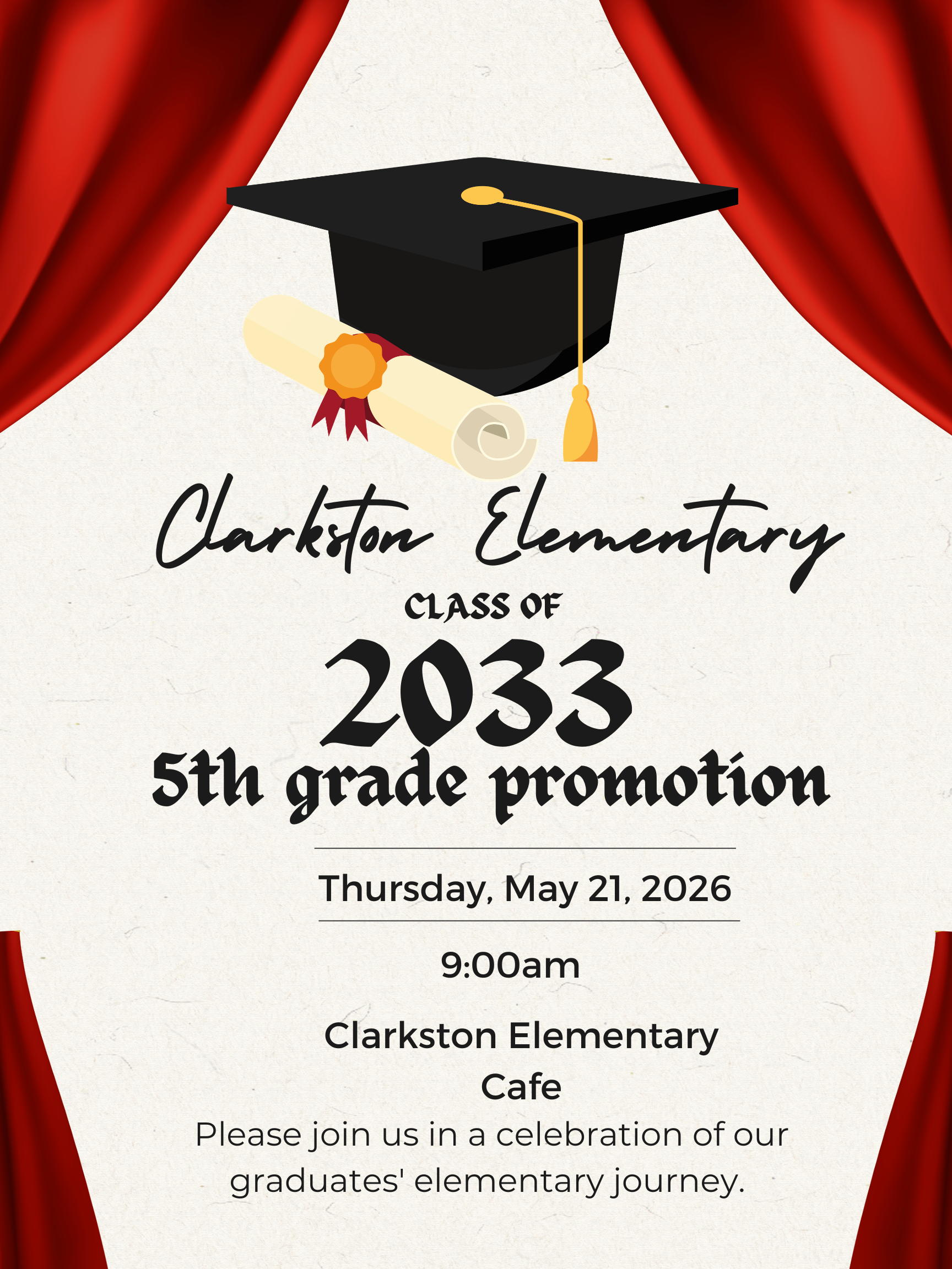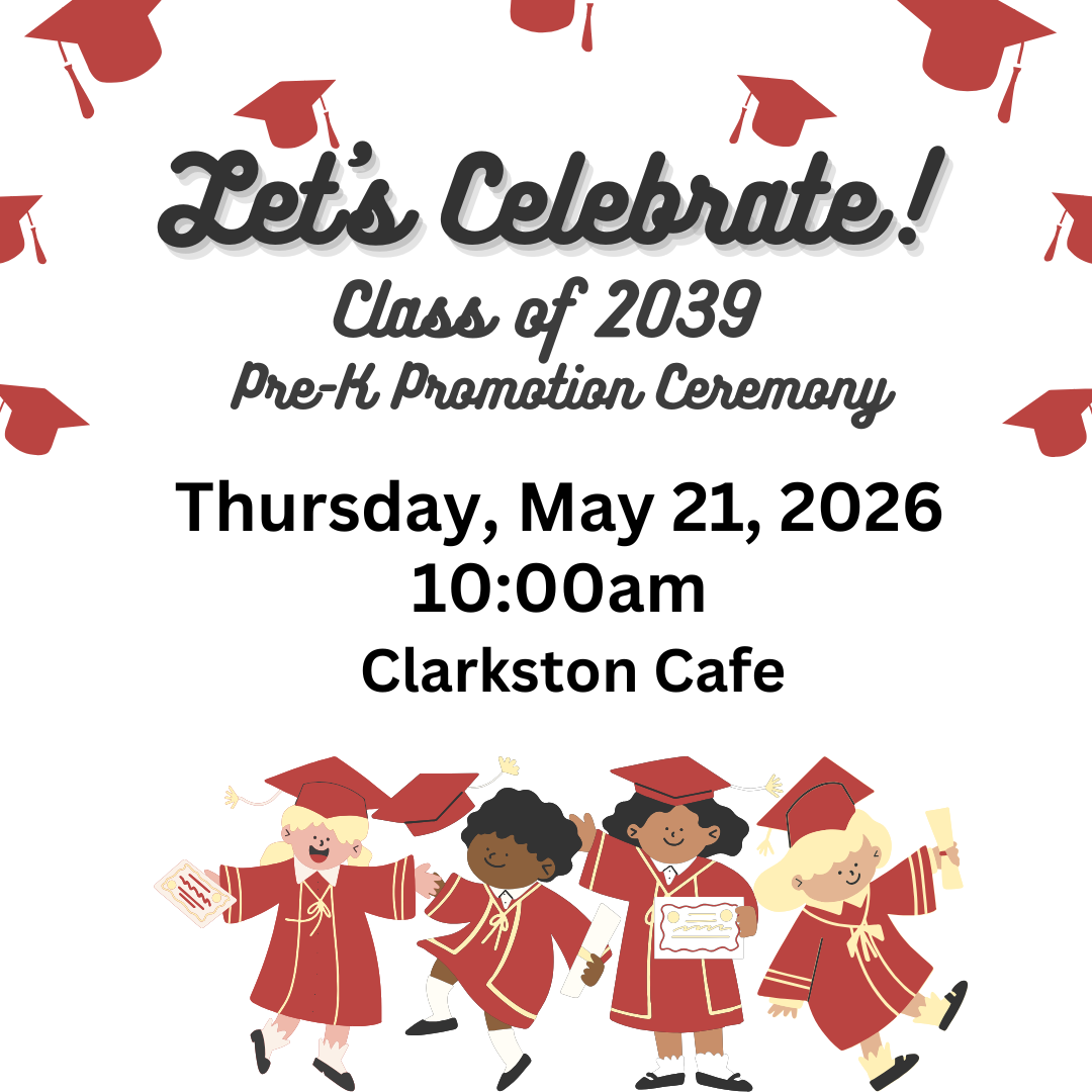 Pre-K & 5th Grade Promotion Ceremonies: Pre-k & 5th grade parents--please join us Thursday, May 21st @9:00am (5th grade) or @10:00am (Pre-K) for our promotion ceremonies! The ceremonies will take place in the cafe. Balloons, streamers, and noise makers are not allowed at the ceremonies, but you are welcome to bring other items to celebrate your student(s). All visitors at the ceremonies must have a valid ID to enter the school. Please contact your student's teachers for more details.
