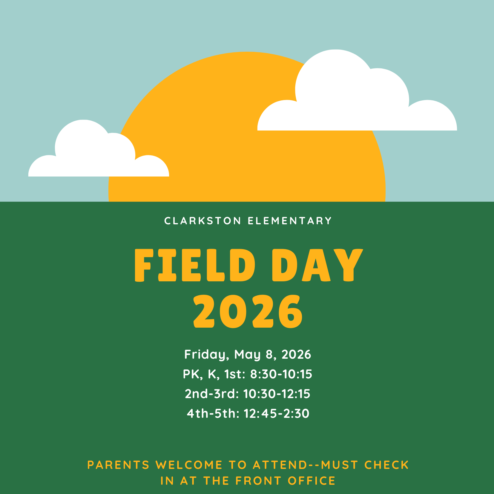 Field Day: Friday, May 8th! Grade level schedule posted in the flyer below. Families are welcome to attend, but must check in at the front office and receive a visitor badge first.