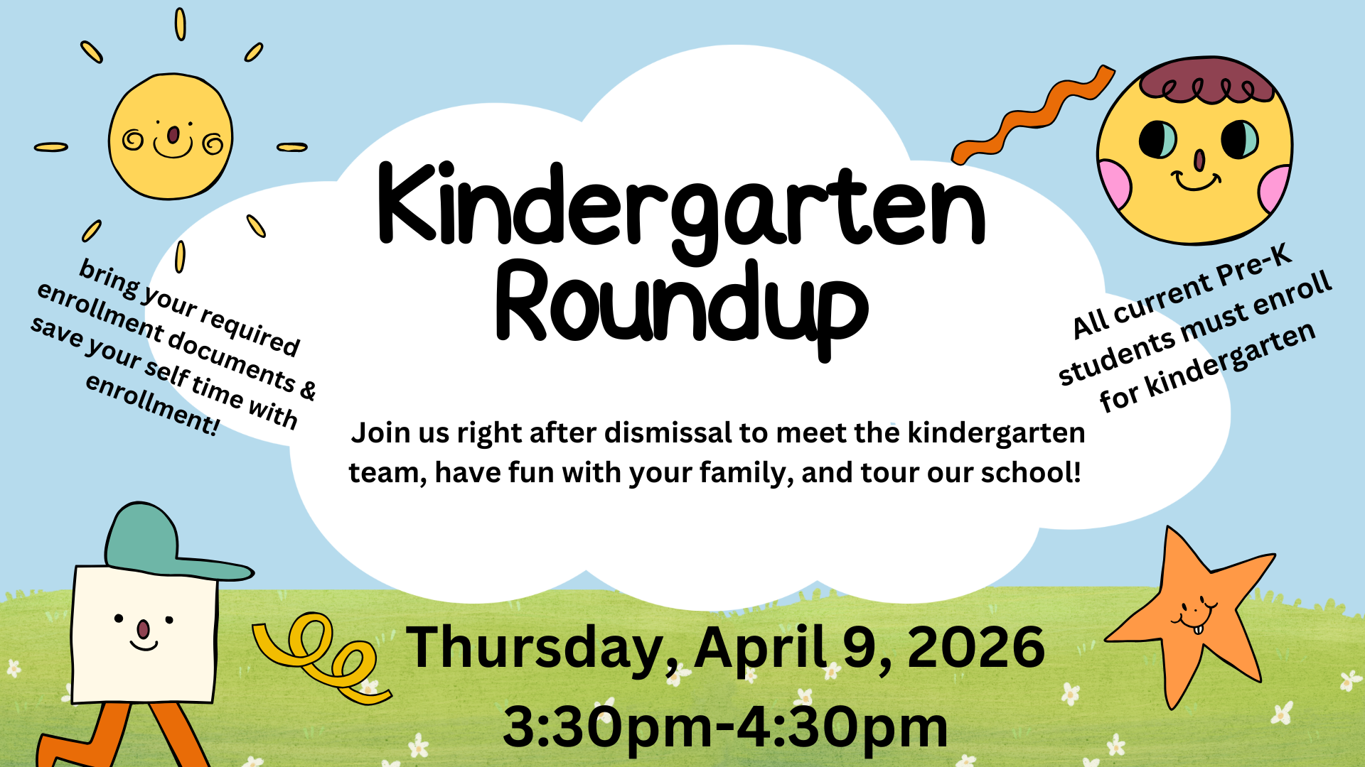 Kindergarten Round Up: Thursday, April 9th--3:30pm-4:30pm if you or someone you know has an incoming kindergartener for the 26-27 school year, we would love for you to join us for Kindergarten Round Up--come meet the kinder teachers, see the classrooms, and get a glimpse into kindergarten life! Families can also bring enrollment documents with them to this event to help with enrollment--birth certificate, social security cards, proof of address, & shot records. This is a come & go event.