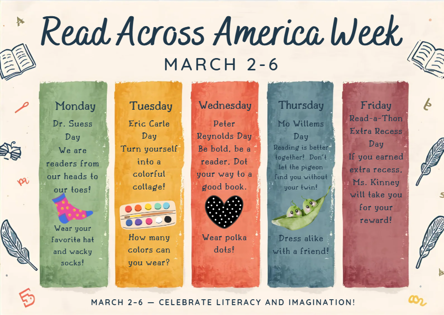 Read Across America (Dr. Seuss) Week: Our campus is excited to celebrate reading with Read Across America Week NEXT WEEK! We are inviting our students to participate in the dress up days for the week--see flyer below!