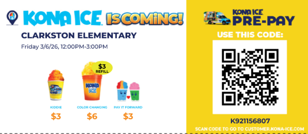 Kona Ice: Friday, March 6th. Online orders are now open. We encourage you to pay online to ensure your student gets a sno cone. Online Ordering Link Online order code: K921156807. Be on the lookout for the Kona flyer coming home on Tuesday, March 3rd.