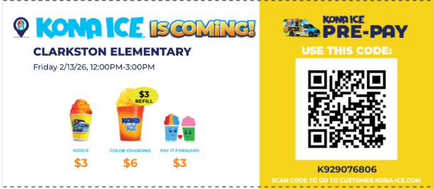 Friday, February 13th. Online orders are now open. We encourage you to pay online to ensure your student gets a sno cone. Online Ordering Link Online order code: K929076806. Be on the lookout for the Kona flyer coming home on Tuesday, February 10th.