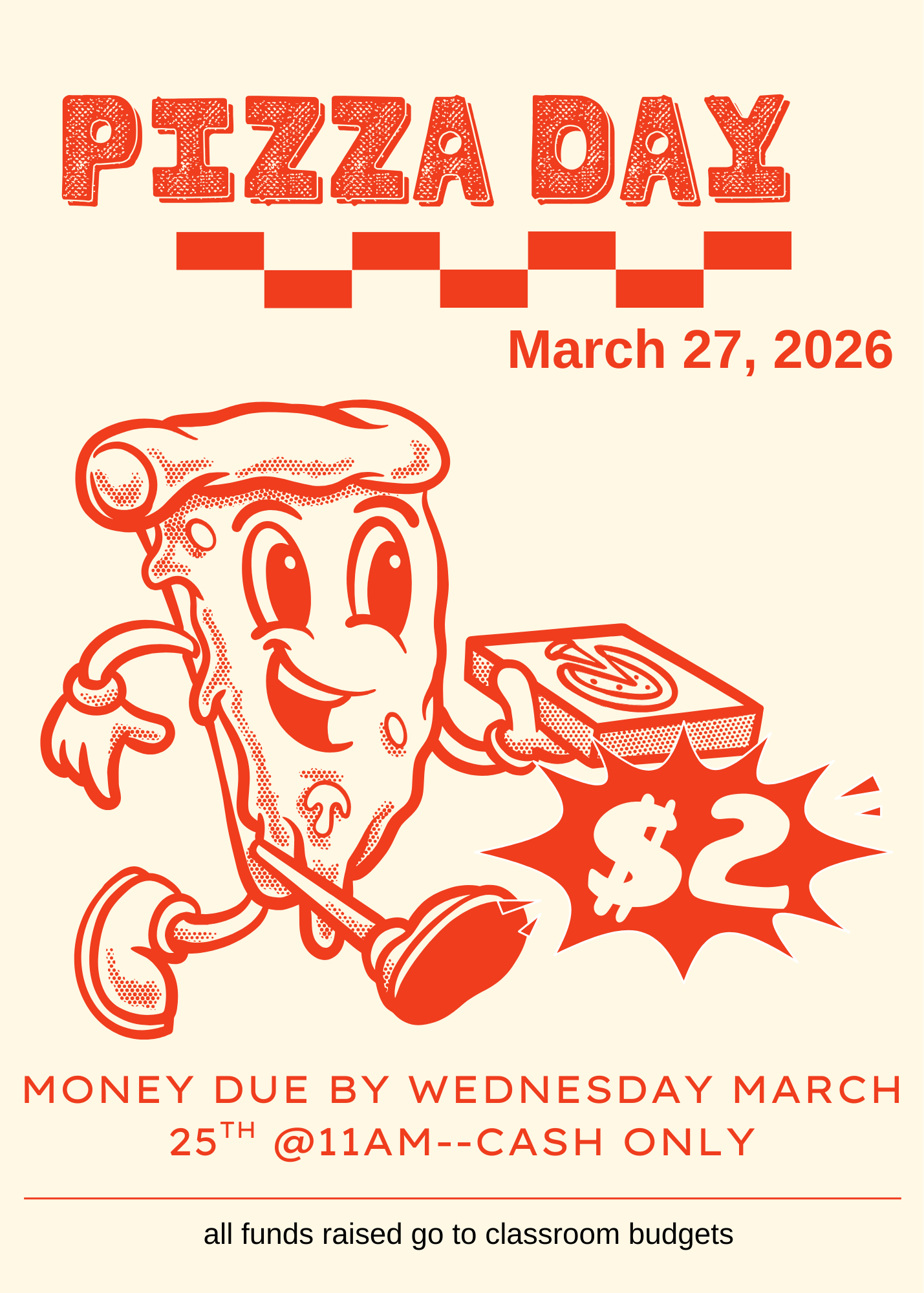 Pizza by the Slice: Friday, March 27th. Please see the flyer below for our monthly Pizza by the Slice fundraiser. Please note that all pizza money must be turned in by Wednesday, March 25th @11am. We cannot make exceptions to the due date/time due to ordering processes with our pizza vendor. Students are not allowed to have individual pizzas delivered to our front offices on these days. If you have any questions or concerns about this, please contact me.