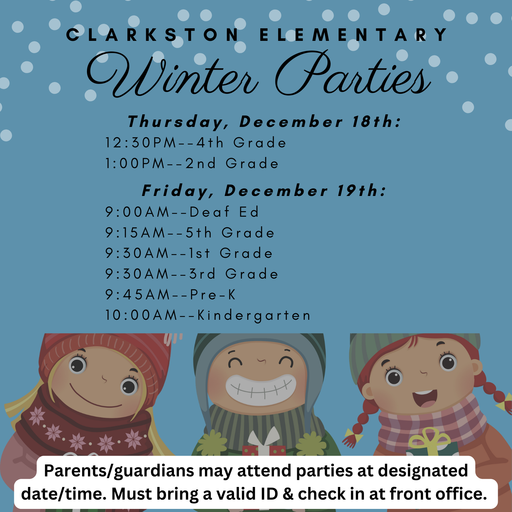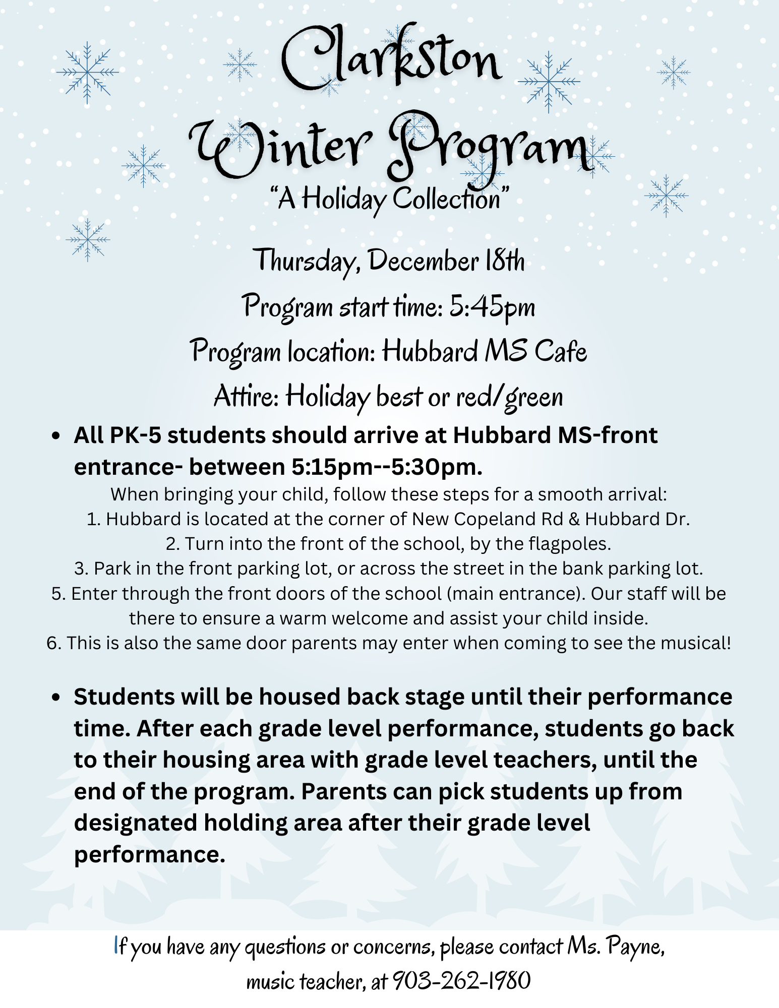 Mark your calendars! We are excited to host our annual Winter Program on Thursday, December 18th, at 5:45pm, in the Hubbard Middle School cafe! All grade levels will perform at this event--there will not be a play in the program this year--just grade levels signing. If you are planning for your student to attend, please be at Hubbard, with your student between 5:15pm-5:30pm so that we can get all students settled before the start of the program. See flyer below for more details.