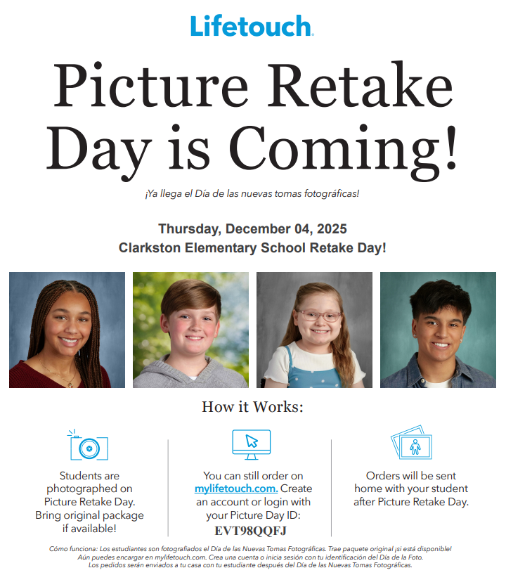 Lifetouch Pictures will be on campus on the morning of December 4th for Fall Picture retakes. This picture opportunity is only for students who have paid for retakes online before December 4th and any students who have moved to Clarkston after our original fall picture date (October 2nd). You can order picture retakes online here: https://my.lifetouch.com/mylifetouch/#/ Picture Day ID: EVT98QQFJ