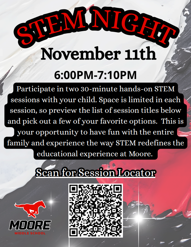 5th grade families: check out the STEM Night at Moore Middle School next week! A great way for you and your families to explore the options Moore Middle School has for your student's middle school experience!