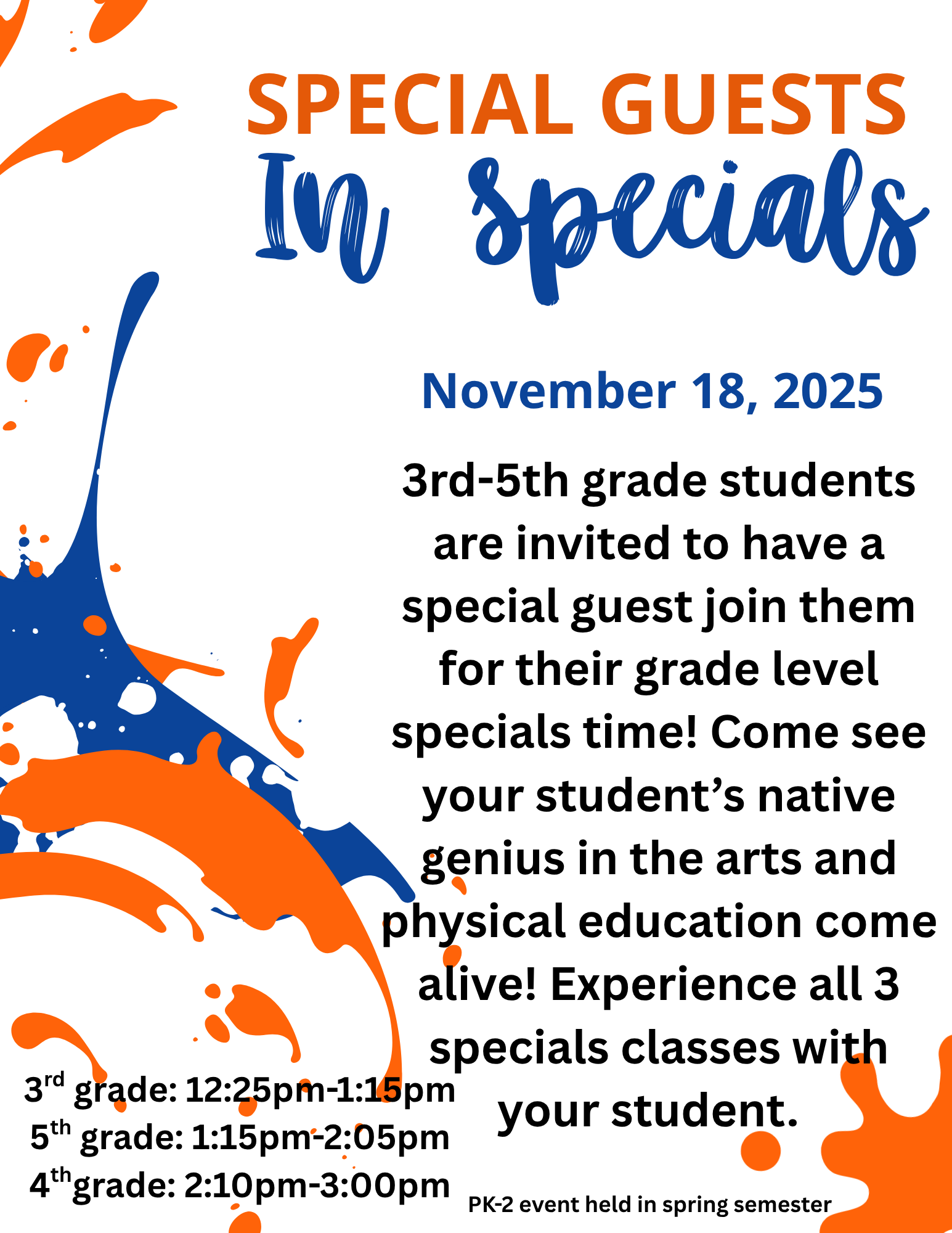 I am so excited for this new opportunity for our students and families this year! Our student lighthouse team (compromised by a group of 3rd-5th grade leaders on campus) wanted to find a way to have families experience more of their school day with them--in particular specials (art, music, PE) classes! We are inviting all 3rd-5th grade parents/guardians out to experience specials time with their student on November 18th, during grade level specials time. Students and their guests will rotate through each specials class, during their grade level specials time, and participate in an activity for that class.